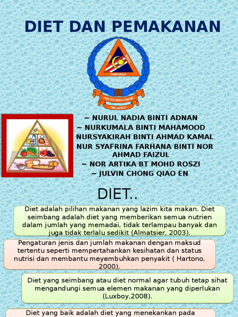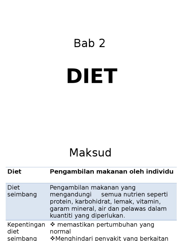 Oleh sebab itu diet dan gizi seimbang adalah kombinasi paling tepat dalam menjaga kesehatan. AMAKSUD DIET DAN DIET SEIMBANG 1MAKSUD DIET Diet bermaksud pengambilan makanan oleh seseorang individu. Diet Seimbang Diet seimbang bermaksud pengambilan makanan yang mengandungi semua nutrien seperti protein.